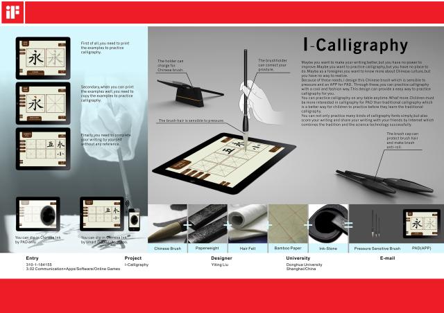 2016年4月7日全球工业设计权威奖项——德国IF设计奖评委会公布了2016年度概念奖的获奖名单。新葡萄官网工业设计系刘奕廷同学提交的“I Calligraphy”作品从11000多件参赛作品中脱颖而出,获得IF概念设计奖(iF STUDENT DESIGN AWARD 2016)。
