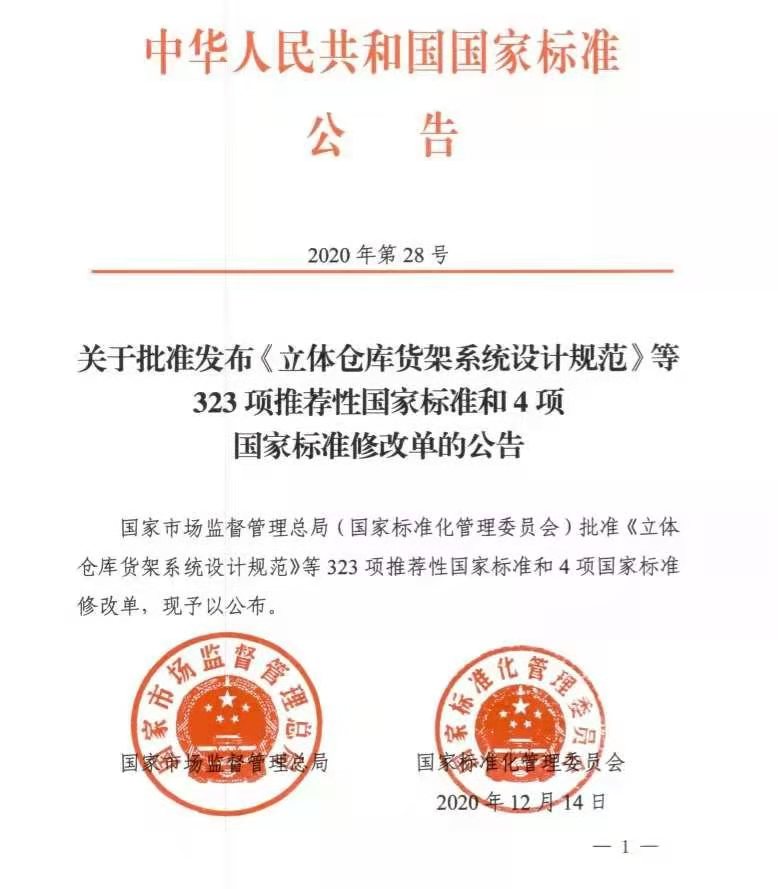 喜讯:新葡萄官网参与的《立体仓库货架系统设计规范》国家标准GB/T39681-2020正式获批发布