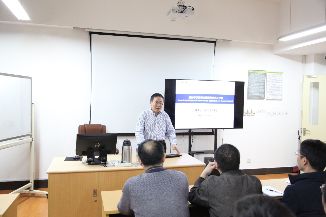 陈教授从精密测量的国内外发展现状出发,深入浅出地介绍了激光干涉技术的基本原理、激光相位调制干涉纳米位移测量技术及激光干涉直线度测量方法等方面,系统讲述了激光干涉精密位移测量技术及测量大仪器装置的研制技术,并阐述了激光干涉测量技术对于国家高端装备制造和国家重大科学工程等领域中准确获取测量数据的重要意义。整个报告会,气氛活跃宽松,陈教授同与会师生开展了积极的交流探讨,并对部分师生在激光干涉测量设备的研制及应用等方面问题耐心地做出了详细解答。