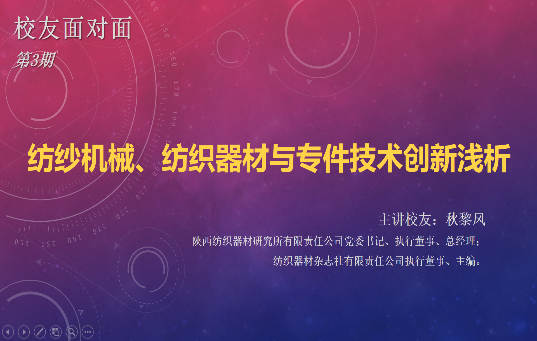 2022年4月22日,新葡萄官网86级杰出校友、陕西纺织器材研究所党委书记兼总经理、《纺织器材》杂志社(纺织器材行业惟一的全国性科技类综合性期刊、全国纺织工业优秀期刊)主编、教授级高级工程师秋黎凤,应邀在线为我单位做《纺纱机械、纺织器材与专件技术创新浅析》专题报告。新葡萄官网AMG副校长陈革,院教授委员会主任朱世根,院长、纺织装备教育部工程研究中心主任单鸿波,副院长周其洪、裴泽光等学院班子成员,部分中青年教师、行业技术专家、博硕士研究生等线上参加了本次报告会。报告会由学院校友会副秘书长李姝佳主持。