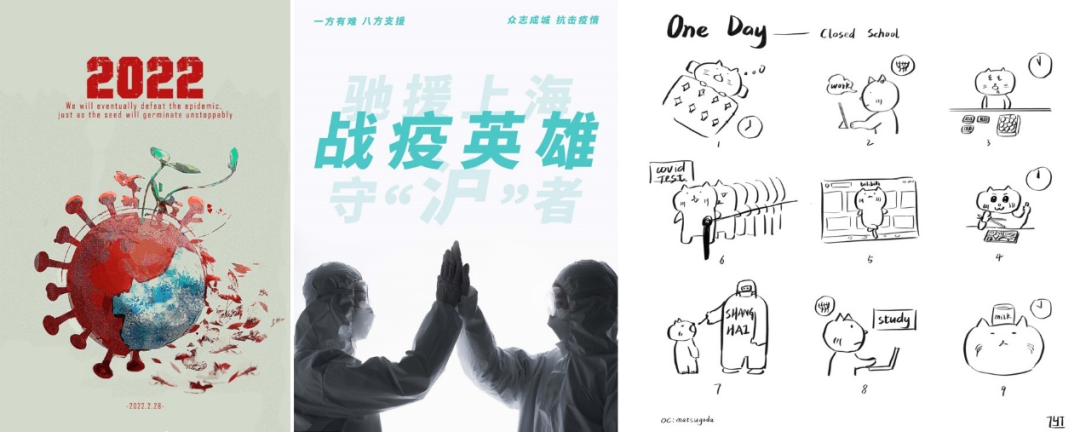 支部党员马采青创作海报《抗疫如芽,必将势如破竹》,以种子发芽比喻抗击疫情斗争,寓意我们终将战胜疫情,如春天发芽的种子冲破大地,击碎被疫情笼罩的病毒阴影,并向着光延伸到更远的地方。杨颖洁创作海报《战“疫”英雄》、翟怡婷创作漫画《封校人的一天》等,致敬无数冲锋在前的“逆行者”,积极营造不畏艰险、奋勇争先、勇于胜利的抗疫氛围。
