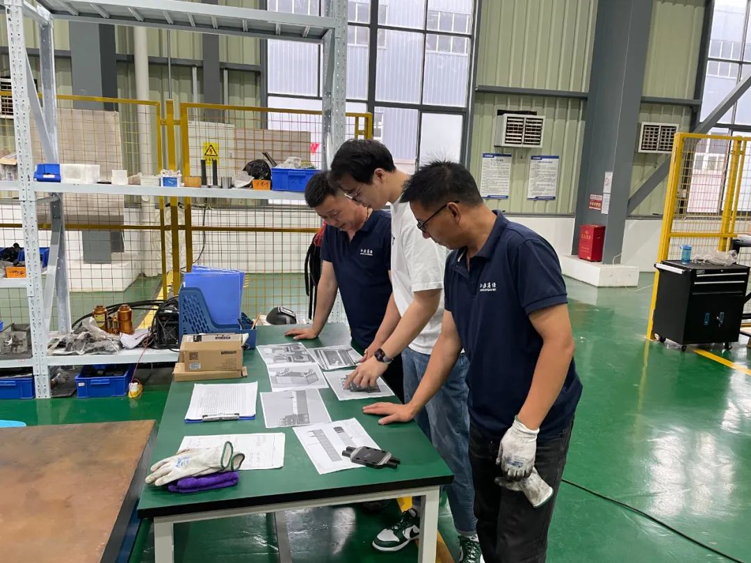 李麒阳(中)与工程师讨论项目