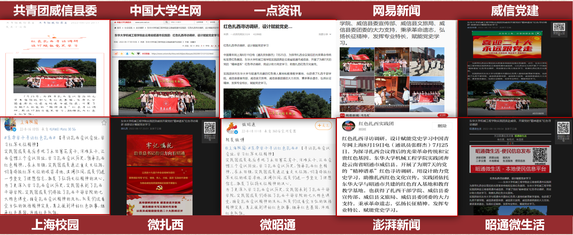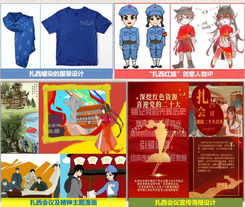 在此次实践期间,共计收到 2070份有效问卷,通过与考察纪实、访谈记录相结合,形成5份文字资料,站在不同的角度,认真分析扎西会议对威信建设的社会效益和影响。实践团循着红军的足迹,编撰《扎西红色调研记》,将红色故事、革命遗址付诸图文表达。团队以扎西红色文化为主体、融合多元文化,设计周边产品图样5类共23幅,文创20类共82款产品。并与当地各部门对接,成功将部分产品实物落地。其中团队成员设计的四款文创产品均已申请版权认证。团队制作云游扎西系列视频、红色文旅宣传视频等共计16个视频,在微博、小红书等网络媒体上累计浏览播放量达6万次。实践团先后获得环球网、中国大学生网、威信党建等总计28家媒体44篇宣传报道。
