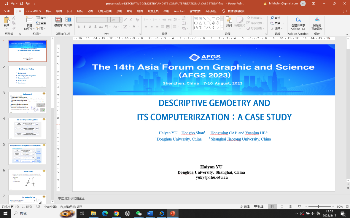 8月7日到10日,“第十四届亚太图学论坛(AFGS 2023)”于在深圳召开。本次论坛由中国图学学会、北京理工大学主办,日本图学会和国际几何与图学会(ISGG)协办。中国图学会理事长赵罡、日本图学会理事长Hirotaka Suzuki、国际几何与图学学会主席Luigi Cocchiarella分别致欢迎辞。新葡萄官网于海燕副教授在会议论坛上作了题为《Descriptive Geometry and its computerization: A case study》专题报告,向国际学者介绍了团队提出的画法几何计算化及形计算理论,展示了我校在画法几何学、图形思维以及几何计算等方面的交叉研究成果,引起与会学者专家的广泛关注。