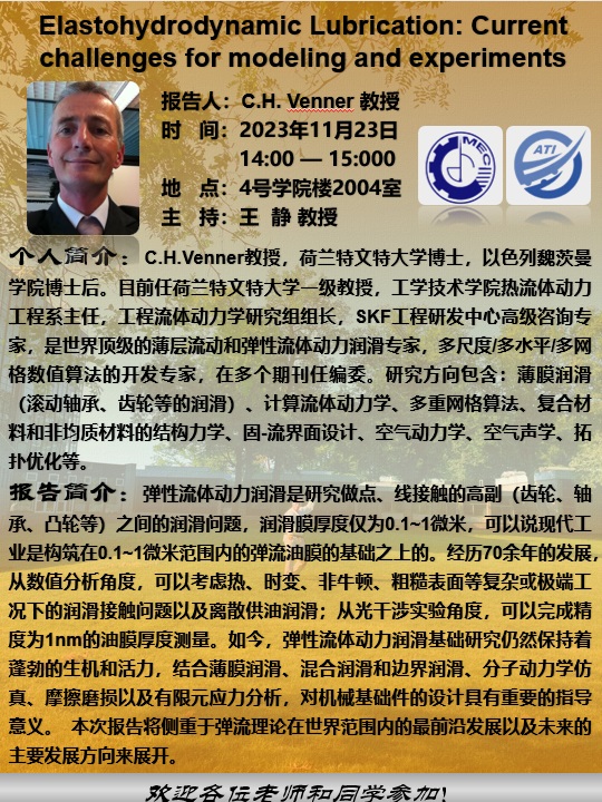 C.H.Venner教授,荷兰特文特大学博士,以色列魏茨曼学院博士后。目前任荷兰特文特大学一级教授,工学技术学院热流体动力工程系主任,工程流体动力学研究组组长,SKF工程研发中心高级咨询专家,是世界顶级的薄层流动和弹性流体动力润滑专家,多尺度/多水平/多网格数值算法的开发专家,在多个期刊任编委。研究方向包含:薄膜润滑(滚动轴承、齿轮等的润滑)、计算流体动力学、多重网格算法、复合材料和非均质材料的结构力学、固-流界面设计、空气动力学、空气声学、拓扑优化等。2023年8月获瑞典SKF公司Jacob Wallenbergs 基金奖.