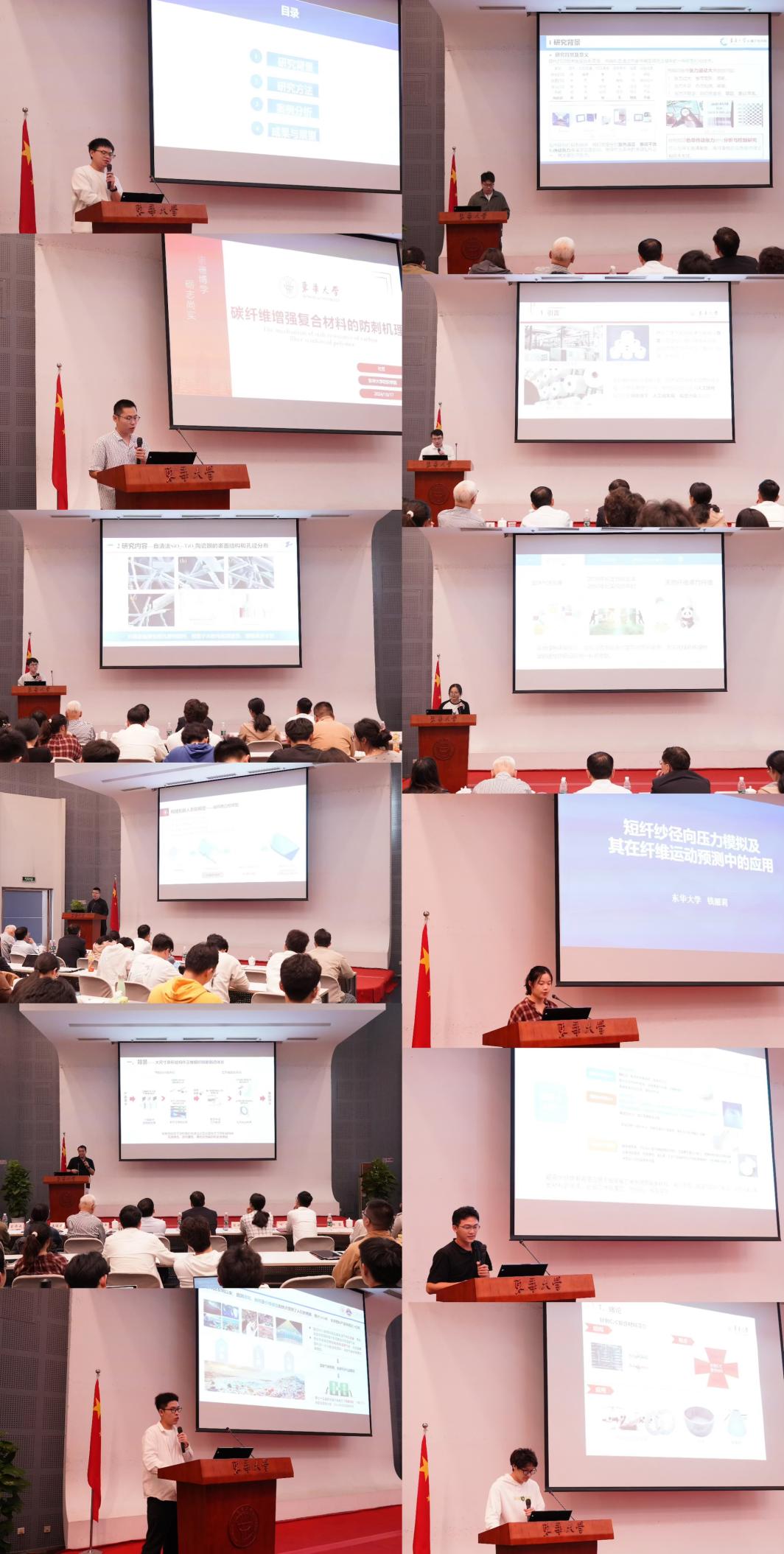 学术报告从大尺寸异形结构芯模编织策略及纱线轨迹预测,到通过固态拉伸工艺制备具有更高生物降解性的异山梨醇改性共聚酯单丝;从面向羊毛混纺面料生产流程知识的碳图谱建模与应用,到碳纤维增强复合材料的防刺机理;再到热转印系统色带传动张力的非线性控制研究,以及用于增强油水分离的自清洁陶瓷膜等,无不体现着学子们的严谨的科研态度以及取得的丰硕科研成果。