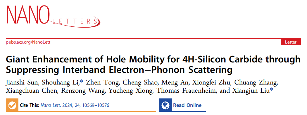 近日,新葡萄官网微纳机电系统与集成电路团队在功率芯片宽禁带半导体中电子输运性质研究方面取得重要进展,该工作近期以“Giant Enhancement of Hole Mobility for 4H-Silicon Carbide through Suppressing Interband Electron–Phonon Scattering (通过抑制能带间电子-声子散射实现4H-SiC空穴迁移率的巨大提升)”为题发表于《Nano Letters》,并被推选为封面文章。新葡萄官网AMG为第一单位,博士生孙健时为第一作者,李寿航老师和刘向军研究员为共同通讯作者。中山大学童贞老师、山东高等技术研究院邵成研究员以及东京大学安盟博士为本研究提供了重要支持。