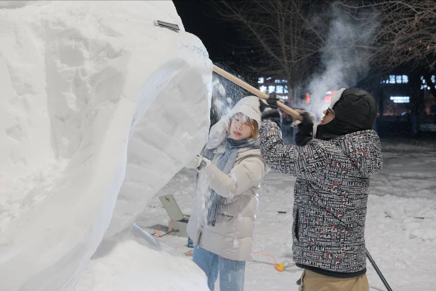 从破晓到黄昏,甚至夜幕降临后,创作仍在继续。灯光下,手中的工具在雪块上精雕细琢,师生一心,共同克服着寒冷与疲惫带来的重重困难。