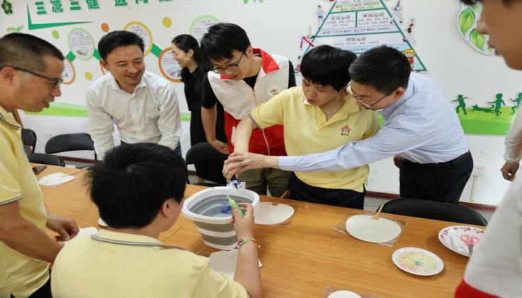 志愿者通过“端午知识连连看”互动追溯传统文化,并生动讲解"机器狗"的科技原理。学员们体验漆扇制作时,将彩漆滴入水中创作个性作品。单鸿波院长参与活动并鼓励:"科技无障碍,勇于探索即是创新"。活动实现文化传承与科技启蒙双效融合。