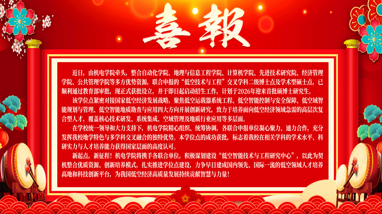 查看详情近日,由beat365在线唯一官网牵头,整合自动化学院、地理与信息工程学院、计算机学院、先进技术研究院、经济管理学院、公共管理学院等多方优势资源,联合申报的“低空技术与工程”交叉学科二级博士点及学术型硕士点,已顺利通过教育部审批,现正式获批设立,并于即日起启动招生…