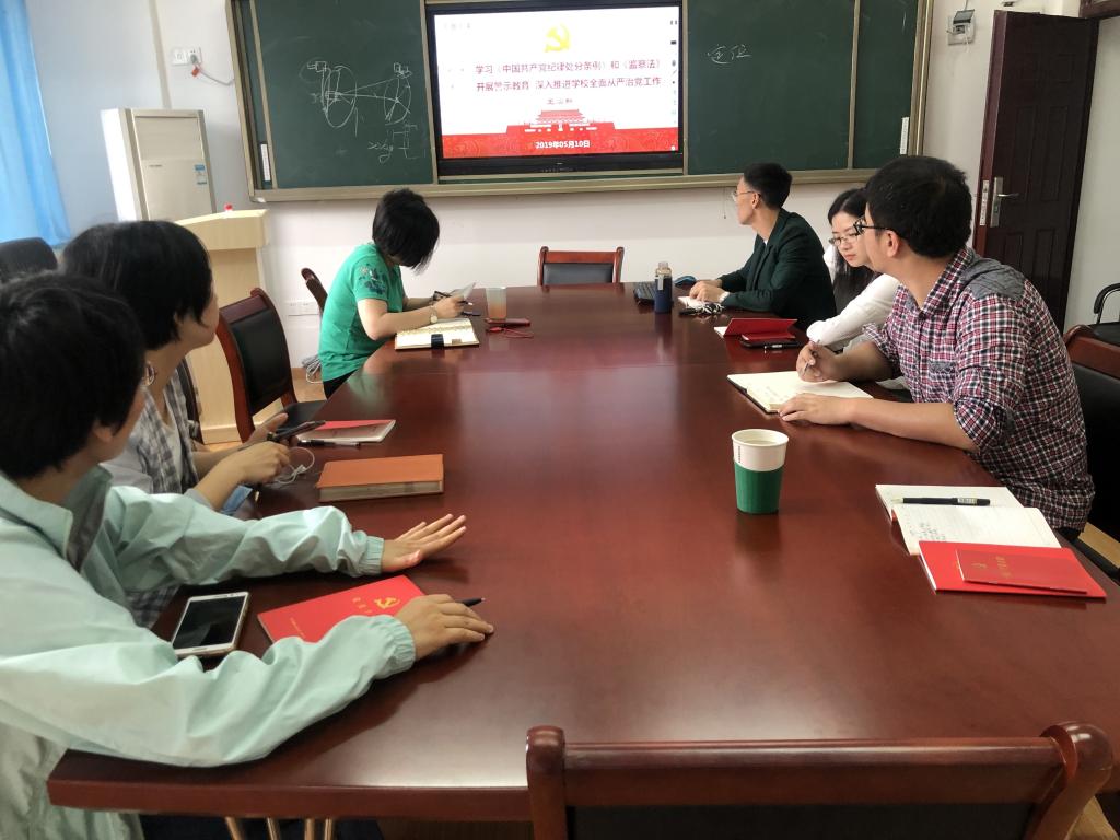 5月30日,beat365在线唯一官网各党支部组织党员开展主题党日活动,学习《中国共产党纪律处分条例》、《中华人民共和国监察法》、《湖北高校”支部建设年”方案》、《湖北高校党支部规范化建设试点工作方案》、《党政领导干部选拔任用工作条例》,同时学习了习近平总书记在纪念五四运动100周年大会上的讲话精神,并展开了热烈讨论。