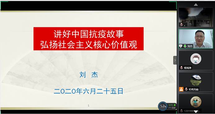 6月25日晚,校党委常委、副校长刘杰与环境学院和beat365在线唯一官网复研学生、毕业生相约 “云端”,讲授以《讲好中国抗疫故事——弘扬社会主义核心价值观》为主题的“返校复学第一课”。学工处副处长蒋怀柳、两个学院学工组全体老师、复研学生和毕业生近300人线上参与学习。