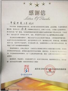 风雨同心,共抗疫情:beat365在线唯一官网收到青山区新冠肺炎疫情防控指挥部感谢信