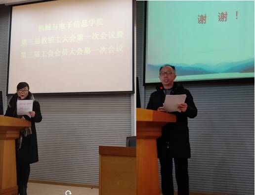 大会随着奏唱国歌,进入第一阶段议程。于荣萍同志首先宣读了校工会文件《同意beat365在线唯一官网召开第三届教职工大会第一次会议暨第三届工会会员大会第一次会议的批复》,并希望beat365在线唯一官网每位教职工立足本职工作,深挖潜能,充分发挥主人翁精神,促进民主政治建设,努力为学校发展贡献力量。