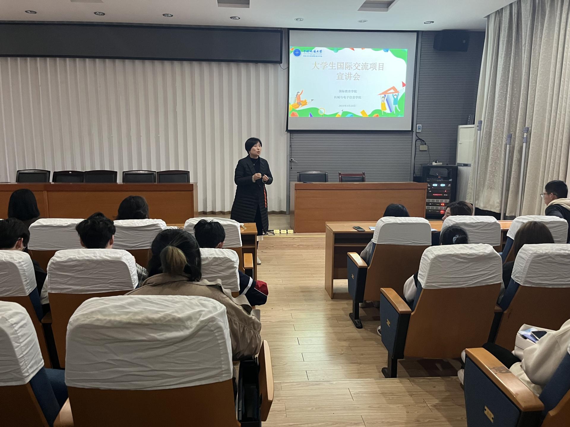 国际教育学院李雅莉老师介绍了学生参与beat365官网国际交流项目的申请方式、申请流程、如何进行出国手续办理、在行前准备中需要注意些什么,并对学生们特别关心的“大学生国际交流基金”资助申请进行了详细介绍,提醒同学们进行国际交流时的注意事项,通过案例分享介绍了往届参加大学生国际交流项目学生的心得体会。