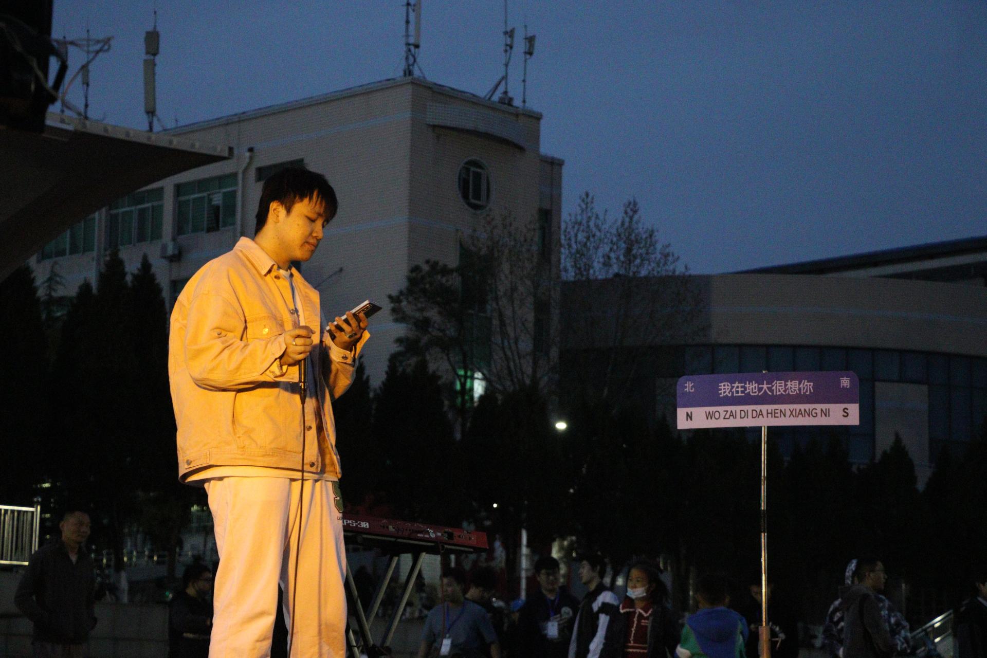 两个音响、一条灯带围出的舞台旁边,一圈一圈的同学席地而坐,时而打开手机灯光来回摇动,时而跟着歌手一起合唱。