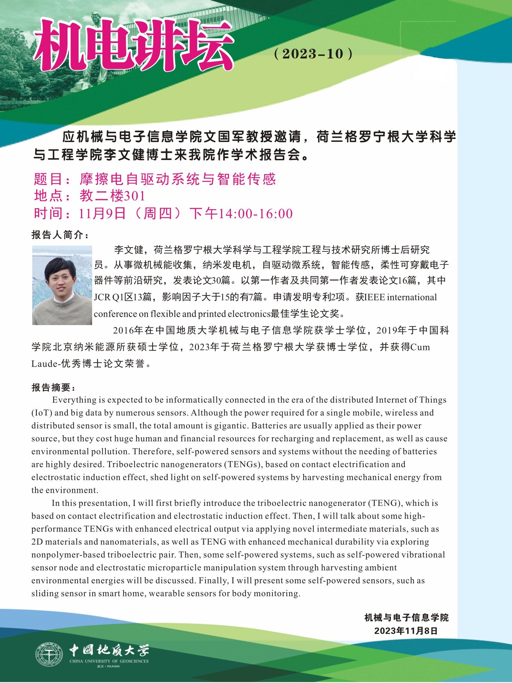 【11月9日】机电讲坛(2023-10):荷兰格罗宁根大学科学与工程学院李文健博士来beat365官网作学术报告会