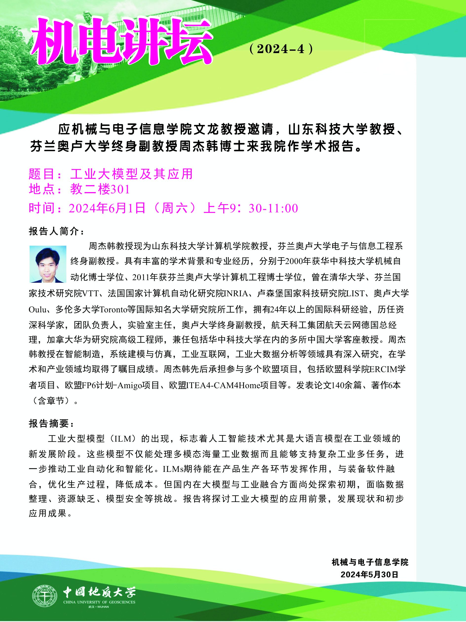 【6月1日】机电讲坛(2024-4):山东科技大学教授、芬兰奥卢大学终身副教授周杰韩博士来beat365官网作学术报告会