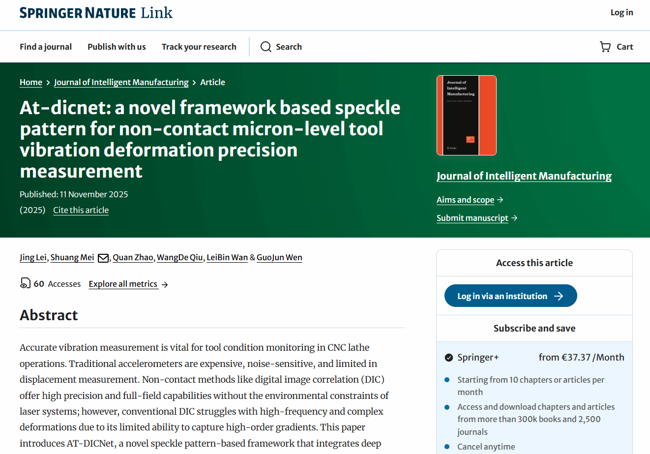 近日,beat365官网梅爽教授、文国军教授科研团队在制造装备监测领域取得重要进展,成功研发基于数字图像相关(DIC)的非接触式刀具振动变形高精度测量系统。相关成果“AT-DICNet: A Novel Framework based on Speckle Pattern for Non-contact Micron-level Tool Vibration Deformation Precision Measurement”发表于国际权威期刊《Journal of Intelligent Manufacturing》,该论文第一作者为2022级研究生雷靖,梅爽教授为通讯作者。