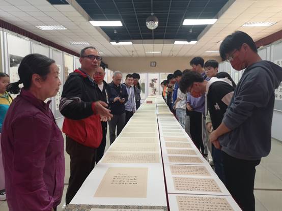 参观过程中,离退休教职工赵俊明、曾佐勋、孙立鹏、杨筠、刘国萍等不时同学生党员们深入交流,并结合展示作品进行了生动翔实的讲解。长达30米, 7215000余字的长篇书法作品《共产党宣言》展现离退休教职工对党、对祖国、对学校的热爱和敬意;意境深刻的校庆对联讲述了学校的创建历史、概括了学校发展奋斗历程;曾佐勋教授现场朗诵散文作品深情表达了八方才俊建设地大铸就辉煌、大师学者走出地大回报社会的动人故事……一幅幅书法作品、一张张摄影图片、一件件手工文创,丰富的实物陈列吸引了学生党员们的目光,生动的讲述加深了他们对地大光辉历程的了解,激励他们要时刻发挥先锋模范作用,弘扬优良传统,更好地秉承艰苦朴素、求真务实的校训精神。
