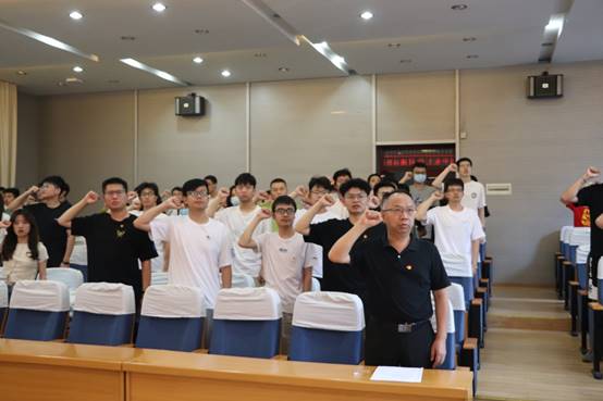 毕业生党员谭淞元带领全体党员重温入党誓词。