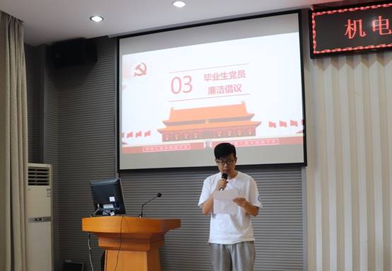 毕业生党员池田雨同学代表全体毕业生党员宣读廉洁倡议书,号召大家深入学习《关于加强新时代廉洁文化建设的意见》,始终牢记党员身份,加强道德修养,筑牢思想防线。在今后的工作生活中,要坚守初心,弘扬正气,发挥党员先锋模范作用。聚是一团火,散是满天星,无论身处何地,都要永葆初心之志、继续砥砺前行。