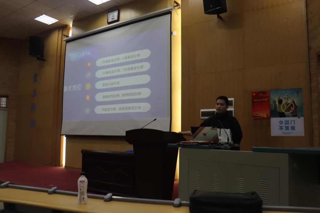 以搜狐在高校产学研方面的合作成果介绍为例,雷畅借助PPT对优秀同学的绘画作品进行了展示,并对“会画画”和“游戏产业画师”进行了概念辨析,点明了游戏企业需要的人才类型;以“聚变工作室”为例,在校大学生提供了新的思路:以游戏为基础,为青年劳动力提供平台学习普通话等技能,其社会反响良好。