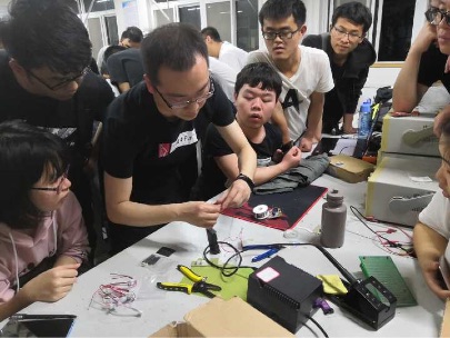 随后,刘松明又向同学们讲解了小车的焊接与组装。他先对单片机、超声传感器等元件的基本知识进行详细说明,并着重强调了小车几个主要模块、电路各个部件的作用功能,驱动原理等需要重点注意的地方。王伦对焊接方法与焊接过程中需要注意的事项进行了强调,他提到:“焊接一定要注意焊接顺序,一个部分由一个人单独完成,以防出错。”并结合现场演示电源包与电机的焊接,以便大家更好的理解。