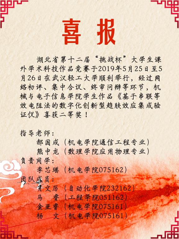 [2019年6月]beat365官网学生作品荣获第十二届“挑战杯”湖北省二等奖